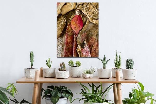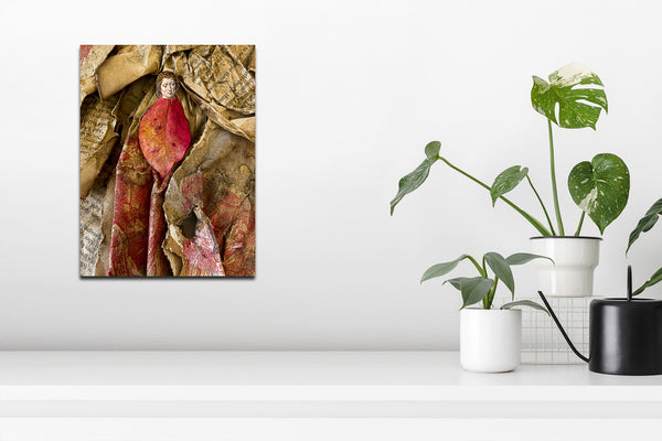 The real leaf used here is from my Royal Purple Smoke Tree. The pages are from the Through the Looking Glass book that my father read to us for years. Though hard to sacrifice that book, I used the pages for a 2018 sculpture installation , Book Leaves, at The Kent Museum in Vermont (see photo).