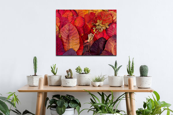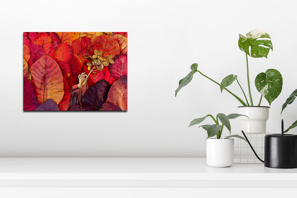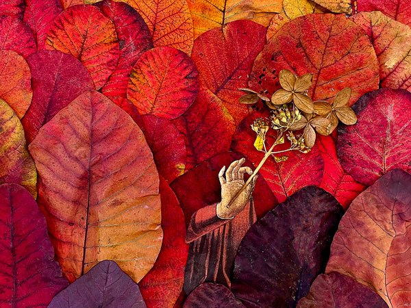 The Brilliant Leaves series started by collecting the fallen leaves from my two smoke trees (see photo). The vibrant leaves in Gift are from my Royal Purple Smoke Tree. The hand holds a sprig from my hydrangea.