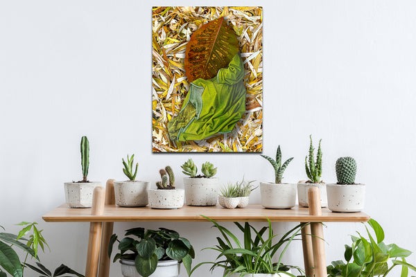 In this image the green drapery is a detail from Rogier Van der Weyden’s The Magdalen Reading. The real leaf with its bit of green segue is from my Grace Smoke Tree. The leaves that blow over from my neighbor's Weeping Willow form the background.