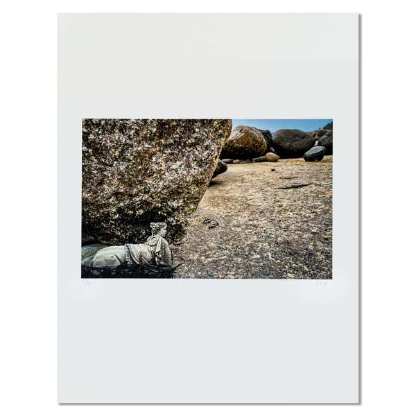 From the series, Norton Island Visions, created during an artists' residency in Maine's uninhabited Norton Island. I wandered the enchanted island daily with my leftover collage cut-outs, giving them new life by photographing dramatic scenes I discovered in the trees and rocks. I love low-tech; so the directness of these photographic adventures was a joy. The images are my souvenirs of that dreamy world.