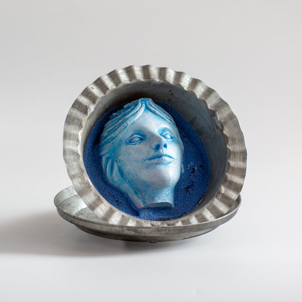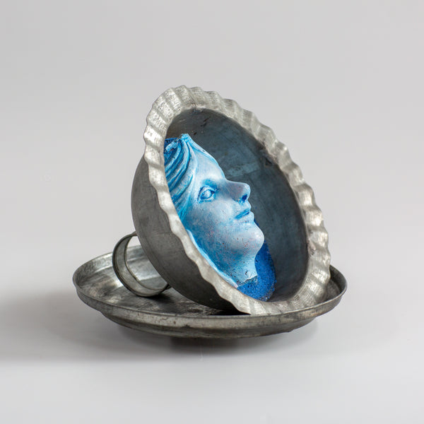 Imaginary portrait, two-part sculpture. Oil on resin with blue aggregate, found tin. 5.5" x 6" x 6"