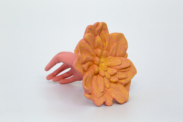 Some background on how I created the Cuffed series. I modeled a small hand in clay inspired by the hands in Parmigianino’s 1530 painting, Madonna of the Rose. After making a mold of the refined plaster version, I cast the hand numerous times in resin and modeled different “cuffs” onto them using epoxy clay. Then I painted them with either oil paint or acrylic gouache (after a trillion hours of sanding and filing). The hand remains the same in this series, a stand-in for the self. The “cuffs” change as the hands gesture releasing or receiving.