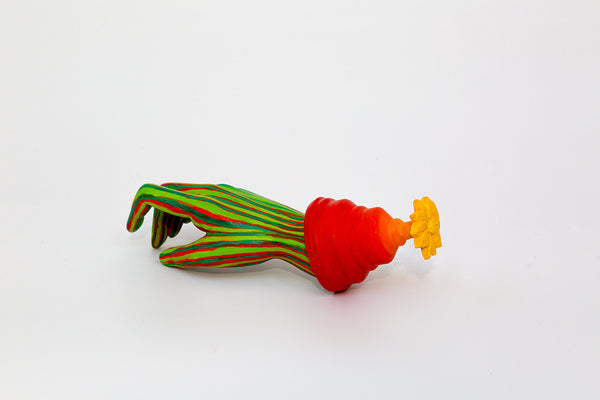 Some background on how I created the Cuffed series. I modeled a small hand in clay inspired by the hands in Parmigianino’s 1530 painting, Madonna of the Rose. After making a mold of the refined plaster version, I cast the hand numerous times in resin and modeled different “cuffs” onto them using epoxy clay. Then I painted them with either oil paint or acrylic gouache (after a trillion hours of sanding and filing). The hand remains the same in this series, a stand-in for the self. The “cuffs” change as the hands gesture releasing or receiving.