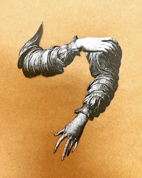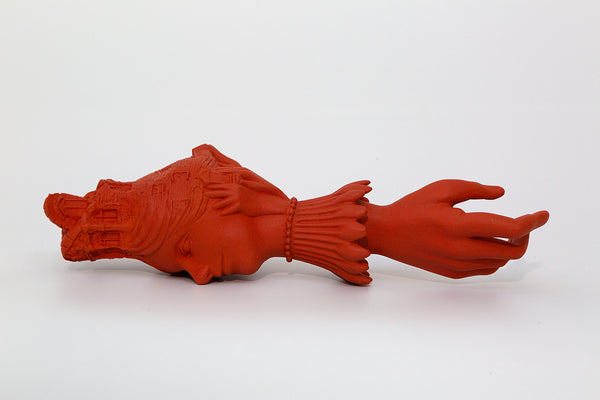 Some background on how I created the Cuffed series. I modeled a small hand in clay inspired by the hands in Parmigianino’s 1530 painting, Madonna of the Rose. After making a mold of the refined plaster version, I cast the hand numerous times in resin and modeled different “cuffs” onto them using epoxy clay. Then I painted them with either oil paint or acrylic gouache (after a trillion hours of sanding and filing). The hand remains the same in this series, a stand-in for the self. The “cuffs” change as the hands gesture releasing or receiving.