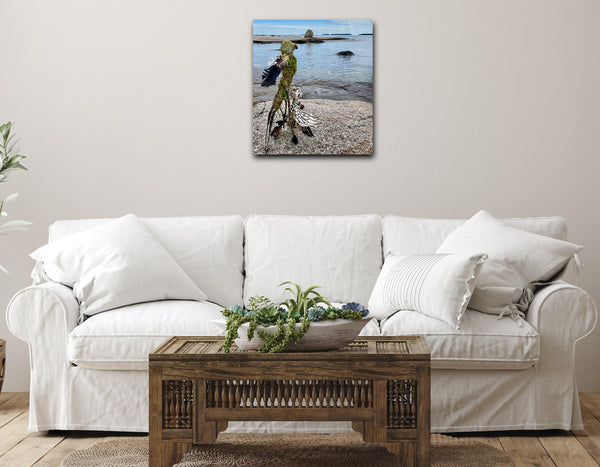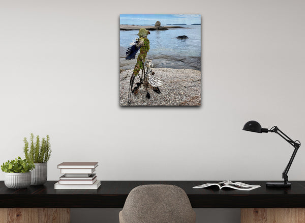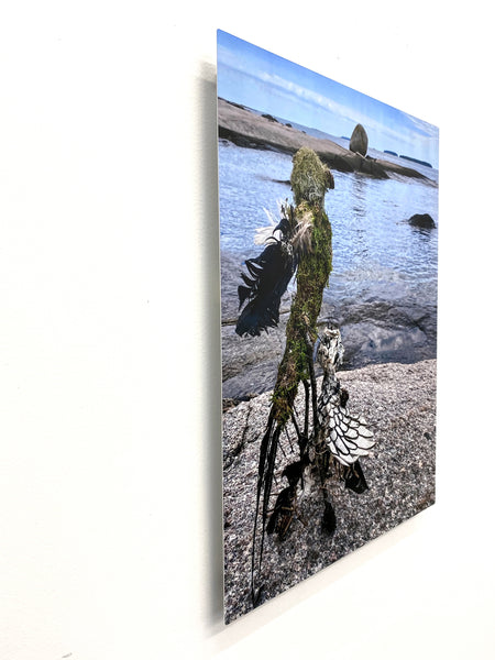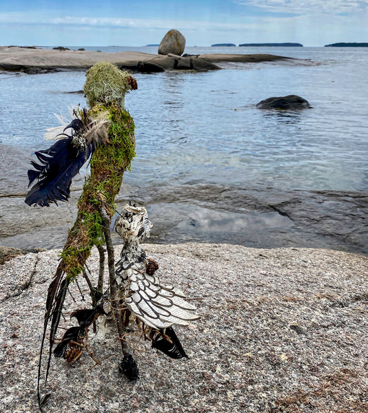 From the series, Wanderers, created during an artists' residency on Maine's Norton Island. I sculpted two "bird-people" from materials within my cabin (book-pages from The Odyssey, glue) and without (twigs, moss, seaweed, pine cones). Wandering the uninhabited island daily, I discovered dramatic landscapes at every turn. These scenes are memories of that unique enchanted world.
