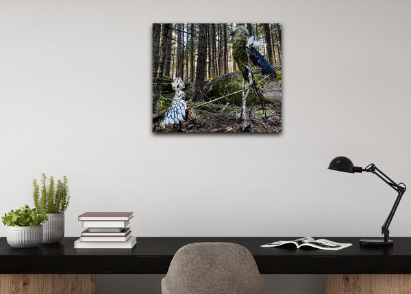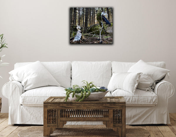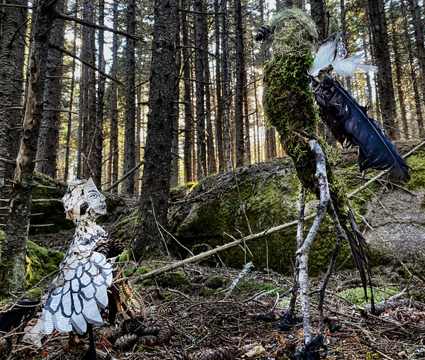 From the series, Wanderers, created during an artists' residency on Maine's Norton Island. I sculpted two "bird-people" from materials within my cabin (book-pages from The Odyssey, glue) and without (twigs, moss, seaweed, pine cones). Wandering the uninhabited island daily, I discovered dramatic landscapes at every turn. These scenes are memories of that unique enchanted world.